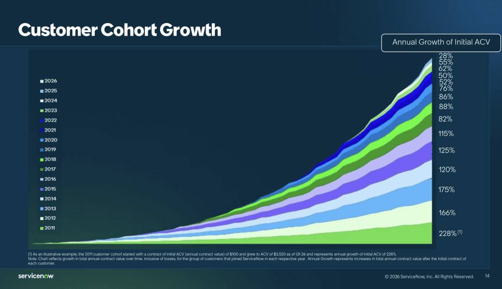 Вот как выглядит компаундинг, когда платформа становится системой учета для корпоративной работы. Большинство B2B-компаний были бы счастливы даже при 120% NRR. У старых когорт ServiceNow эффективные совокупные темпы роста ACV намного выше этого уровня.
