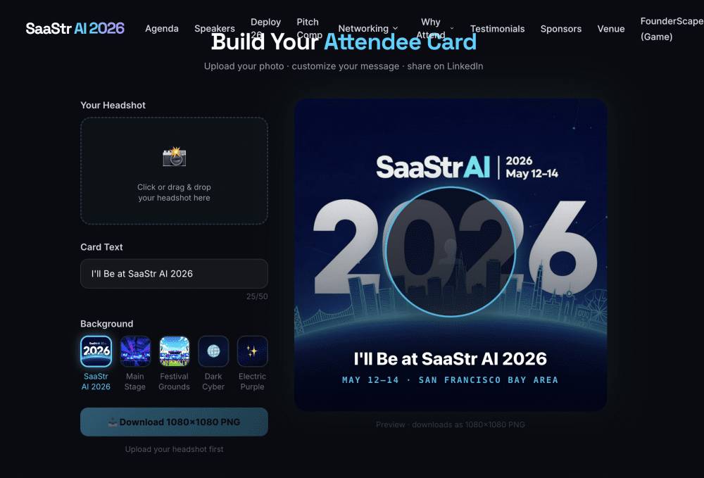 Если вы едете на SaaStr Annual AI 2026 (12–14 мая, Bay Area в районе Сан-Франциско), сгенерируйте свою карточку: saastrannual.com/attendee-card
