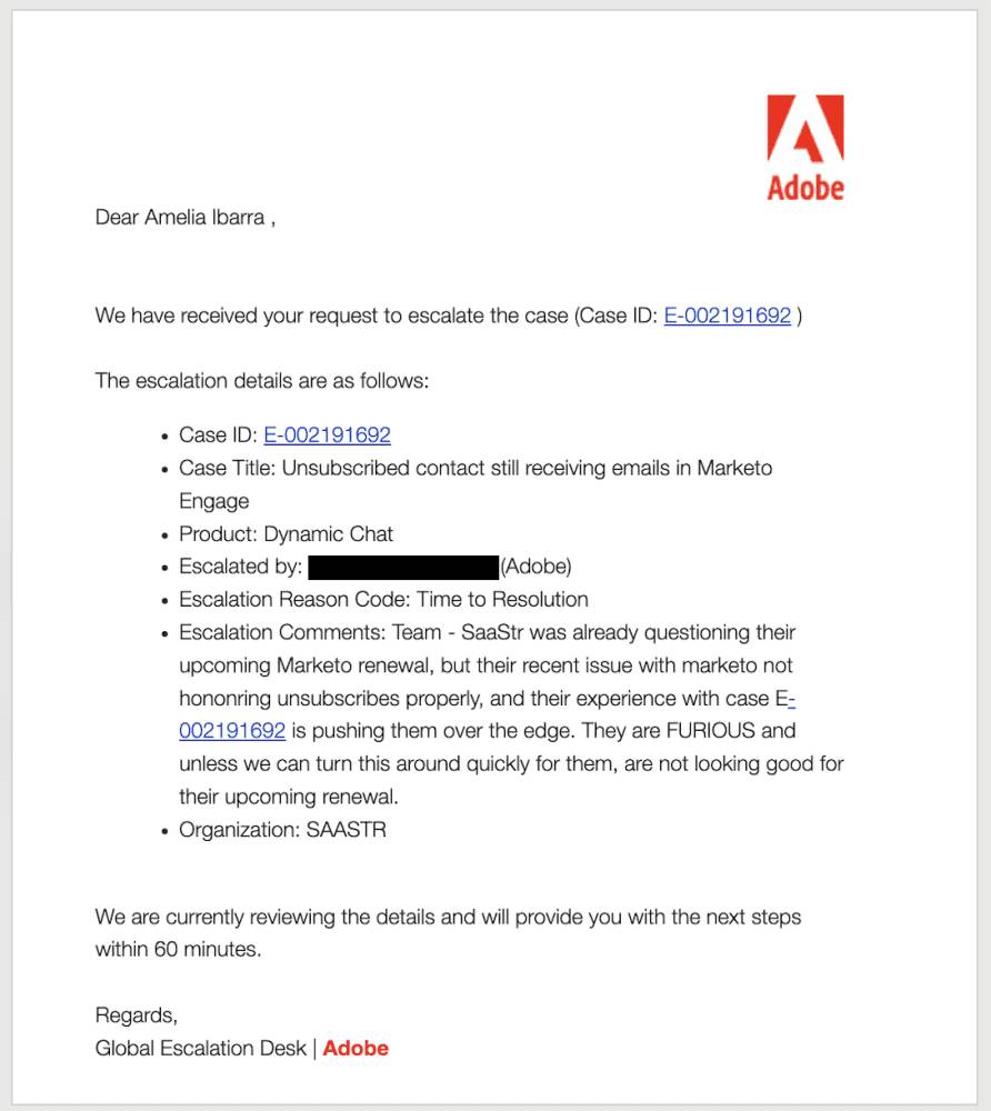 Это Adobe. Письменно подтверждает, в своих внутренних case notes, что Marketo «not honoring unsubscribes properly» — то есть некорректно обрабатывает отписки. И это спустя более чем две недели. На функции, критичной с точки зрения CAN-SPAM.